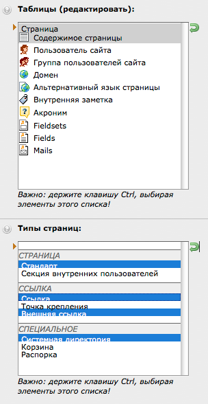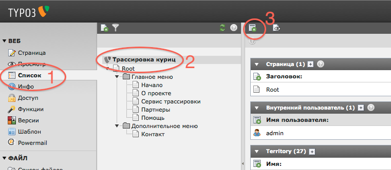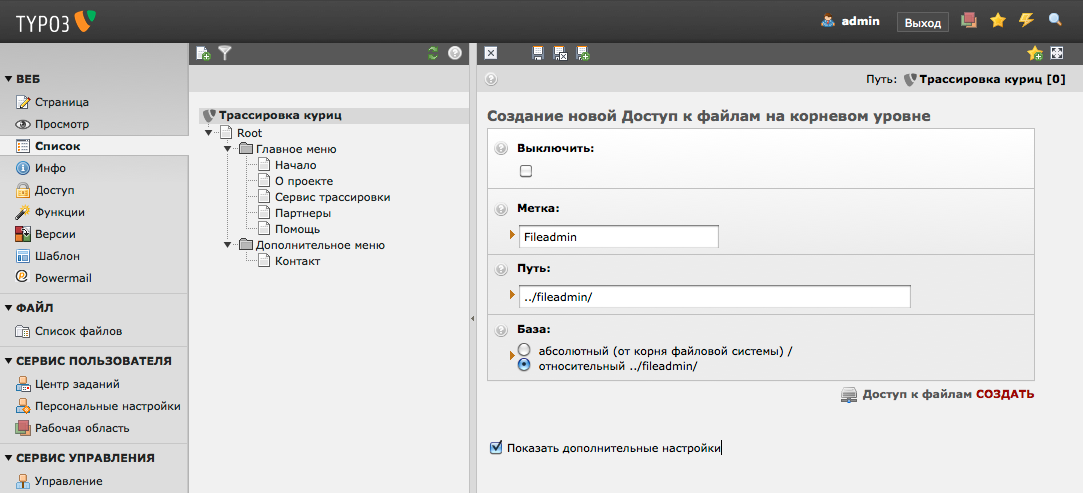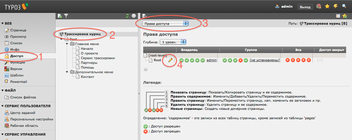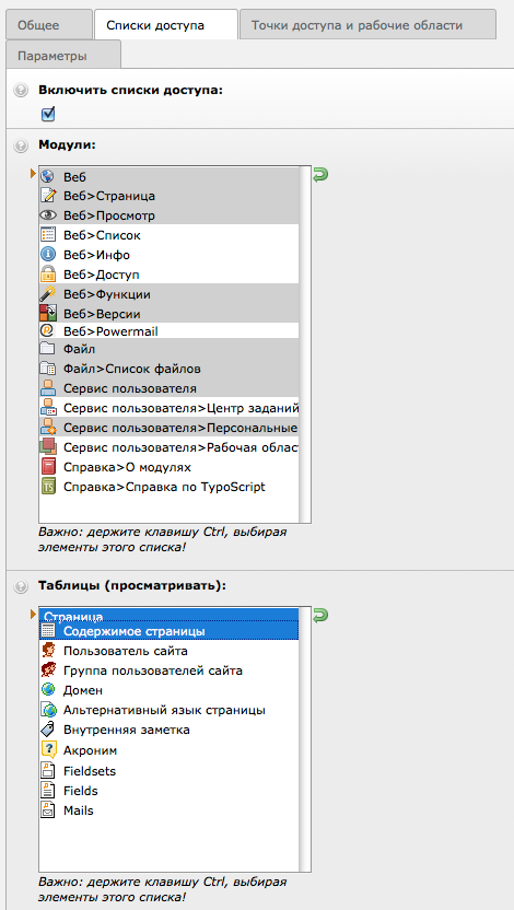 В разделе «Списки доступа» можно подчистить богатый инструментарий Typo3 от ненужных элементов, оставив лишь джентельменский набор.