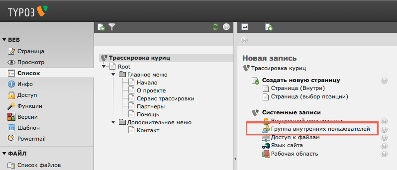 Для начала создадим соответствующую группу «Редакторы». В Сервисе управления пользователями такую функцию можно не искать. Она надёжно спрятана в разделе «Список». Для этого в этом разделе щёлкаем по названию проекта и по появившейся после этого кнопке «Создать новую запись». Появится «Группа внутренних пользователей». Её и выбираем.
