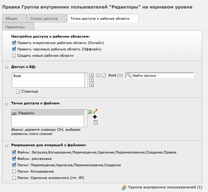 В разделе «Общее» пишем название группы (напр. «Редакторы»), затем переходим в раздел «Точки доступа и рабочие области» и задаём доступ к БД и точку доступа к файлам Fileadmin.