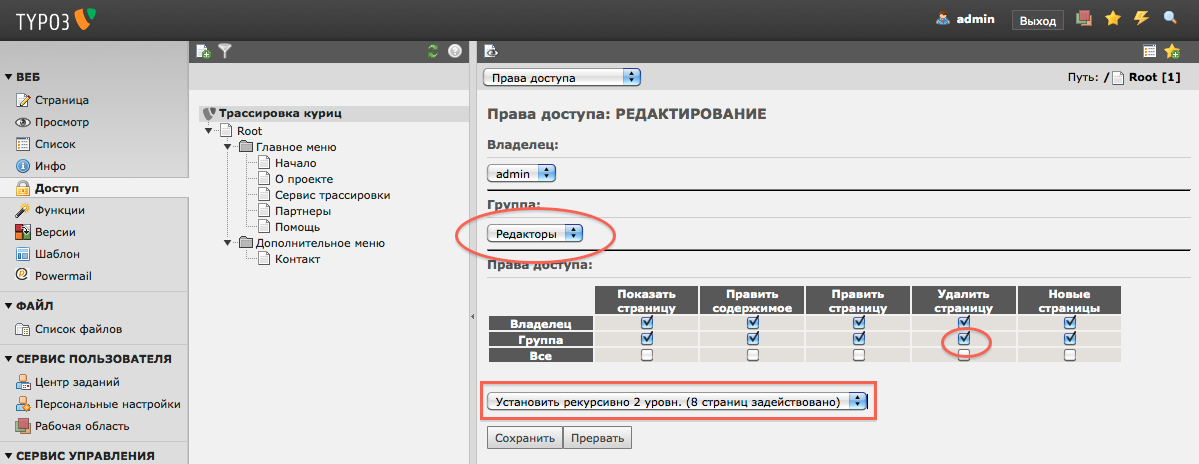 Сохраняем всё это дело и идём в раздел «Доступ». Щёлкаем в средней колонке по названию проекта, и в правой в списке выбираем «Права доступа». Жмём на карандаш возле названия дерева. На появившейся странице устанавливаем группу «Редакторы», внизу «Установить рекурсивно…» самый глубокий уровень и сохраняемся.